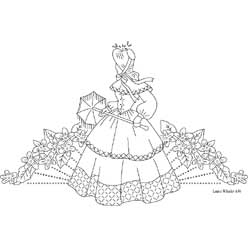 COLOR SUGGESTIONS: Skin: tan, peach or black; mouth: red or rose; eyes: blue, brown or black; hair: gold, henna or brown; skirt: predominating color of the room; blouse: color to contrast with skirt; hat: straw color or black with turquoise, black or blue ribbon; umbrella and shawl: light blue or light green with contrasting fringe; violets: shades of purple with yellow or black centers; wild roses: pink or yellow with yellor or black centers; wild roses: pink or yellow with orange centers; morning glories: blue, purple or wine with orange or yellow centers; leaves and stems: shades of green.