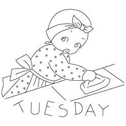 Original instructions as follows: Designs are to be stamped in corners of tea towels. All dresses are red outline and French knots. Aprons black outline. Faces and hands light brown applique. Mouth red satin stitch. Eyes black outline and satin stitch. Caps appliqued of red-checked material. Baskets, chicken and cake are brown; fruit in bin orange; threads bright colors; earrings yellow; parsley around chicken green; dust pan and lettering are red; everything else black or desired color.
